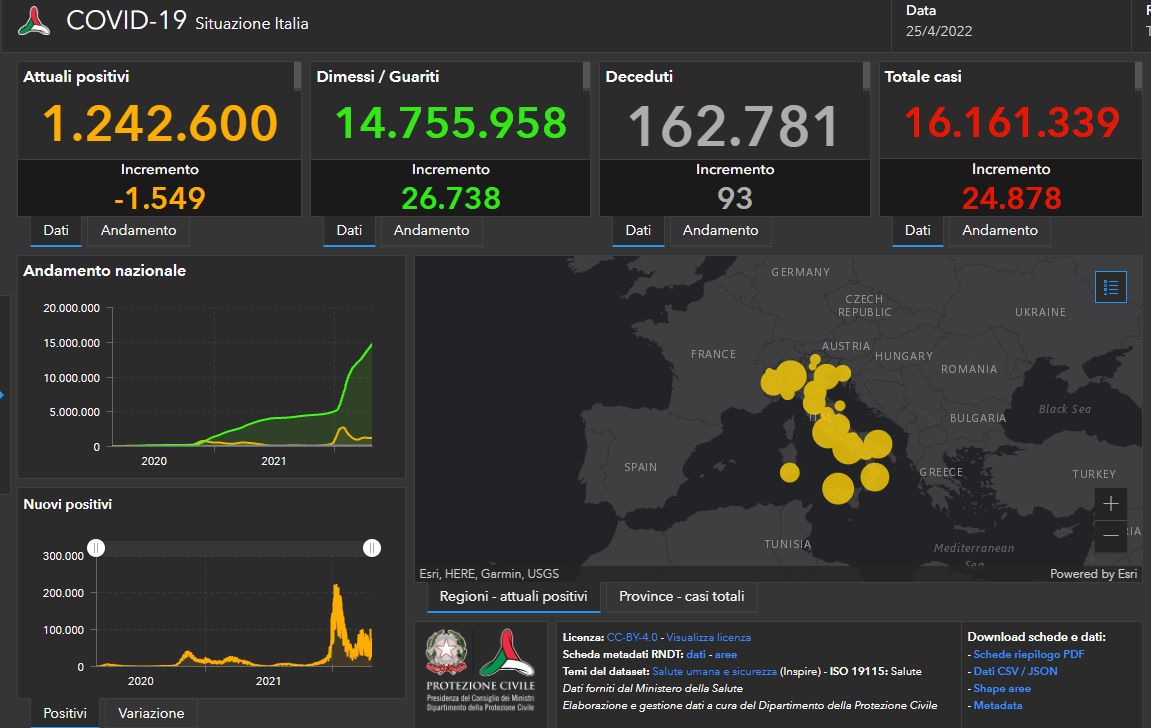Gli attuali positivi nel nostro Paese sono 1.242.600 (-1.549).