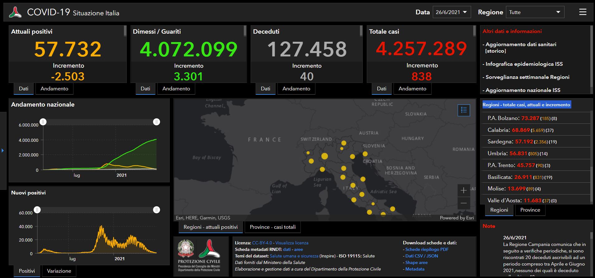 Ministero della Salute, è pari a 838, con un incremento di 85 unità rispetto alle 24 ore precedenti. Ciò a fronte di un numero notevolmente superiore di tamponi processati, 224.494, che fa calare il tasso di positività allo 0,37%. A calare sono pure i decessi, 40 (-16), numero che è però il risultato di un riconteggio dei morti della Regione Campania che in seguito a verifiche periodiche ha riscontrato 20 deceduti non registrati. I guariti sono 3.301 mentre gli attualmente positivi flettono di 2.503 unità attestantosi su un numero complessivo pari a 57.732.