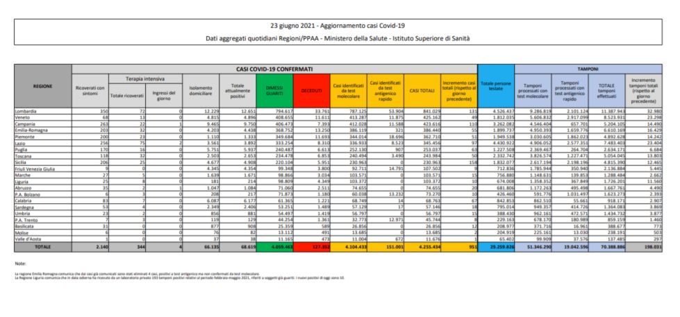 I guariti nelle ultime 24 ore sono 5.455, si riducono gli attualmente positivi di 4.345 con un numero complessivo che si attesta su 68.619. Il calo riguarda pure i ricoveri nei reparti ordinari, dove attualmente si trovano in 2.140, 101 degenti in meno rispetto le 24 ore precedenti; il calo si registra pure nelle terapie intensive, dove oggi si trovano 344 pazienti, con un saldo complessivo nel rapporto ingressi/uscite in negativo di 18 ma con 4 nuovi ingressi, il numero più basso dell’anno. In isolamento domiciliare vi sono 66.135 persone. Per quanto riguarda le singole regioni, la regione con il maggior numero di casi si conferma la Sicilia (158), seguita da Lombardia (131), e Campania (110). Al contrario in Molise e Valle d’Aosta si registra rispettivamente 2 e 1 caso.