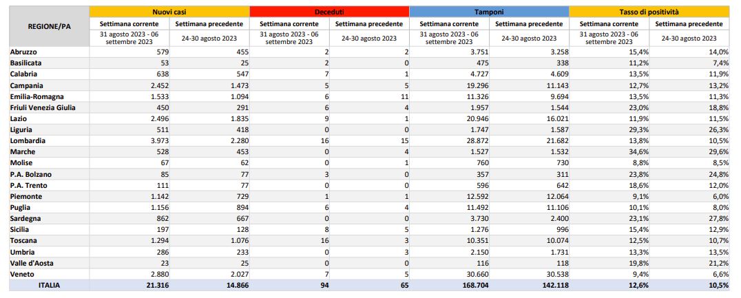 ROMA (ITALPRESS) – Aumentano i casi di Covid in Italia. Nell’ultima settimana, secondo quanto emerge dal bollettino diffuso dal ministero della Salute, i positivi sono stati 21.316, circa 6.500 in più del periodo 24-30 agosto. 94 i decessi, il tasso di positività è passato dal 10,5% al 12,6%.