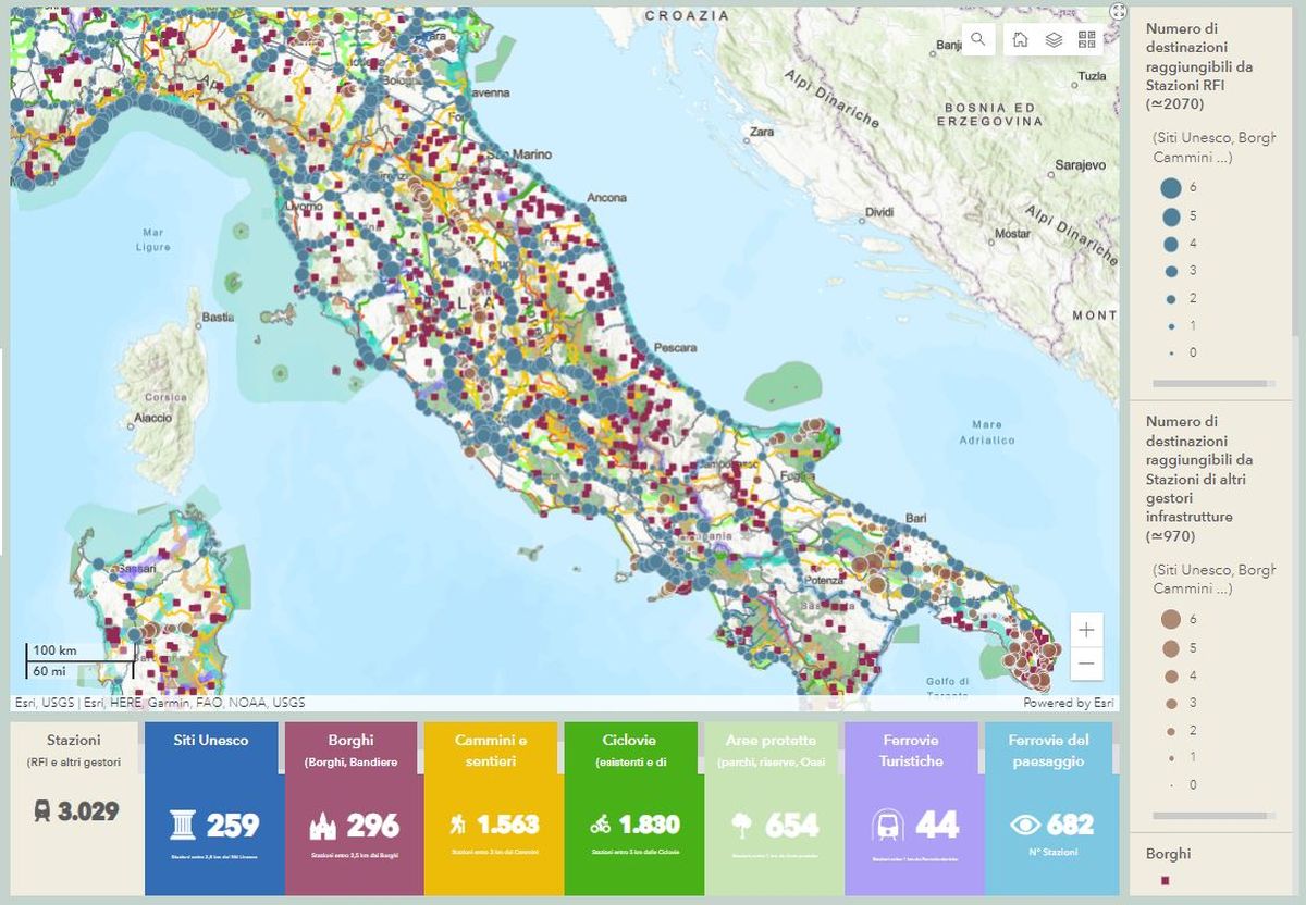 Da oggi sui siti di Rfi e Amodo è possibile consultare l’applicativo sviluppato per mettere in relazione stazioni ferroviarie, ciclovie, cammini, sentieri e greenways con il patrimonio storico, artistico e naturalistico presente su tutto il territorio nazionale. La mappa digitale e interattiva dell’Atlante racchiude infatti una preziosa raccolta di informazioni, utile a orientarsi fra siti di interesse storico e culturale presenti nelle vicinanze delle stazioni. E’ il primo strumento nel suo genere a comprendere in modo integrato, attraverso l’elaborazione dei dati e innovative tecniche di analisi spaziale, la rete di cammini, ciclovie, ferrovie turistiche, parchi, borghi, beni storici e bellezze paesaggistiche presenti in tutta Italia.