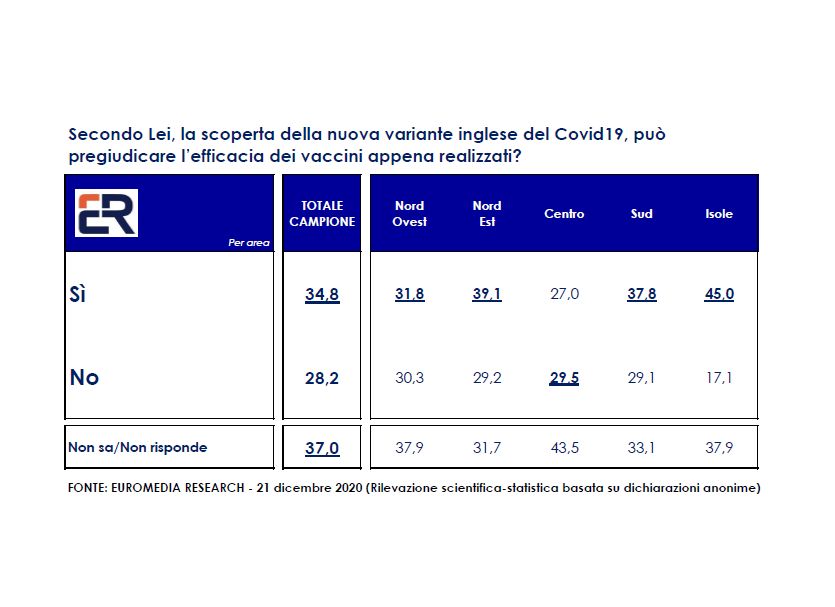 FONTE: EUROMEDIA RESEARCH – 21 dicembre 2020 (Rilevazione scientifica-statistica basata su dichiarazioni anonime)