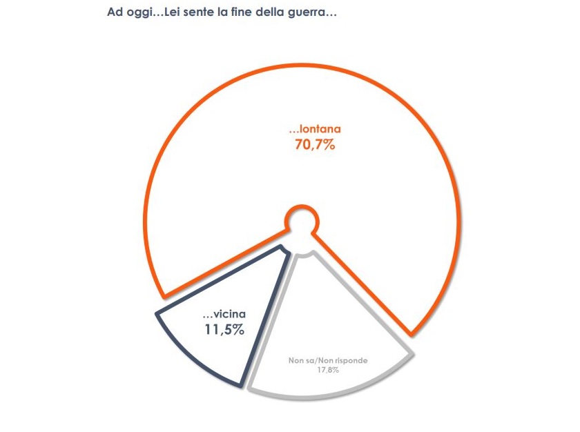 ROMA (ITALPRESS) – Il conflitto tra Russia e Ucraina si prolunga, ormai, da oltre 4 mesi. Quella che, secondo le intenzioni di Putin, doveva essere un’operazione speciale lampo, si è rivelata una vera e propria guerra. Ad oggi, vista tutta la situazione, oltre 2 italiani su 3 vedono la fine di questo conflitto ancora lontana, secondo un sondaggio di Euromedia Research. Solo 1 italiano su 10 esprime ottimismo e vede la guerra avviarsi verso un accordo di pace. Secondo un quarto della popolazione, gli scontri tra Russia e Ucraina termineranno solo quando la diplomazia riuscirà a riunire intorno ad un tavolo i due contendenti e si avvierà un processo di pace a livello internazionale. Altre “soluzioni” che potranno portare alla fine del conflitto sono, da un lato, la capitolazione dell’Ucraina e, dall’altro, la caduta di Putin da parte dei russi stessi. In questo contesto – e per arrivare il prima possibile alla pace – la maggioranza degli italiani continua a dichiararsi contraria all’invio di armi all’Ucraina. Contrarietà che diventa ancora più forte quando si ipotizza l’invio di armi ancora più pesanti ed avanzate rispetto a quelle che il nostro Paese ha fornito fino ad adesso.