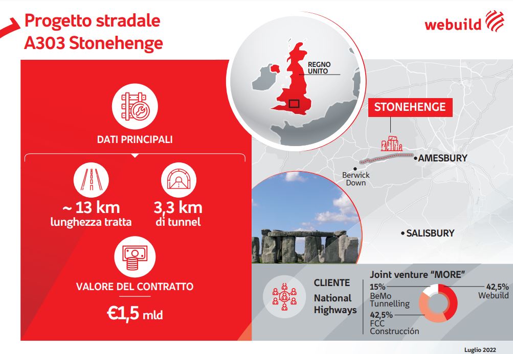 Commissionati da National Highways, i lavori saranno eseguiti dal consorzio MORE, partecipato da Webuild (in quota al 42,5%), insieme con FCC Construcciòn (42,5%) e BeMo Tunnelling UK (15%). Il nuovo contratto – identificato come “A303 Stonehenge – Main Works Contract” – prevede la realizzazione delle opere civili, strutturali, meccaniche, elettriche e tecnologiche del tunnel, con attività realizzate con TBM, oltre alle opere ambientali e alle strutture stradali di accesso alla tratta. La costruzione ha una durata prevista di cinque anni.